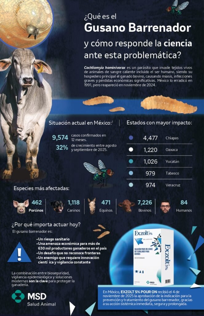 Desde la reaparición del gusano barrenador en México en noviembre de 2024, autoridades y productores han reforzado las medidas de bioseguridad para evitar pérdidas económicas y garantizar el bienestar animal. En este contexto, EXZOLT® 5% POUR ON se convierte en la última innovación en México, con respaldo de pruebas en campo, para la prevención de infestaciones por este parásito, demostrando una eficacia del 100% en 48 horas.